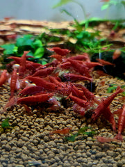 Painted Fire Red Shrimp, they come directly from red cherry created from select breeding. Lines are very bloody red, they might have some brown. Painted Fire Red shrimp can have a clear to bluish hue in their flesh with a solid red shell color.