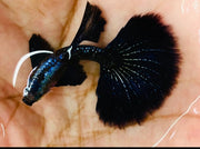 Dumbo Ear Dark Platinum Purple Guppy has a blackish purple tone. They have a halfmoon tail, with snakeskin pattern on the body.