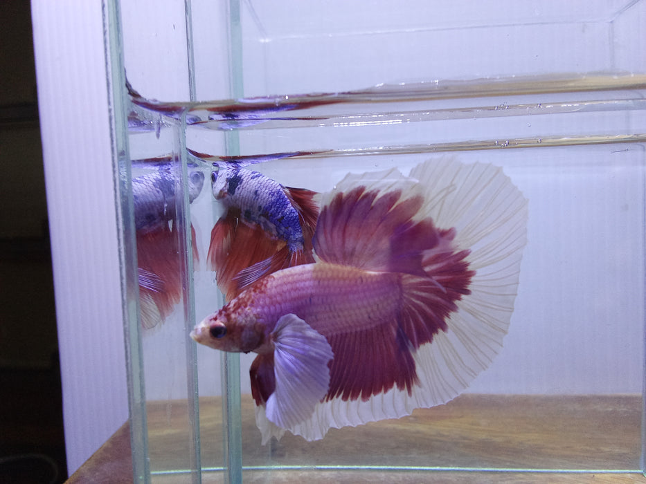 The Pink Lavender Dumbo Ear Halfmoon Betta shares some similarities with the Butterfly Betta, another popular type. Butterfly Bettas are known for their multi-colored fins with distinct patterns, often resembling the wings of a butterfly. While both types are visually stunning, the Pink Lavender Dumbo Ear Halfmoon Betta is distinguished by its specific color palette and unique fin structure. Picture two is a combination called the butterfly lavender dumbo (the distinction of both color hues on the tail is hard to miss)