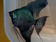 The Pinoy Ghost Angelfish is a unique and highly sought-after variety of Pterophyllum scalare, prized for its rich, green color and sparkle coloration with hints of blue, green and black. This rare angelfish is selectively bred to achieve its distinctive coloration and elegant long fins, making it a striking addition to any freshwater aquarium. Like all angelfish, they are cichlids and may display mild aggression, especially as they mature, but they thrive best in groups of five or more.