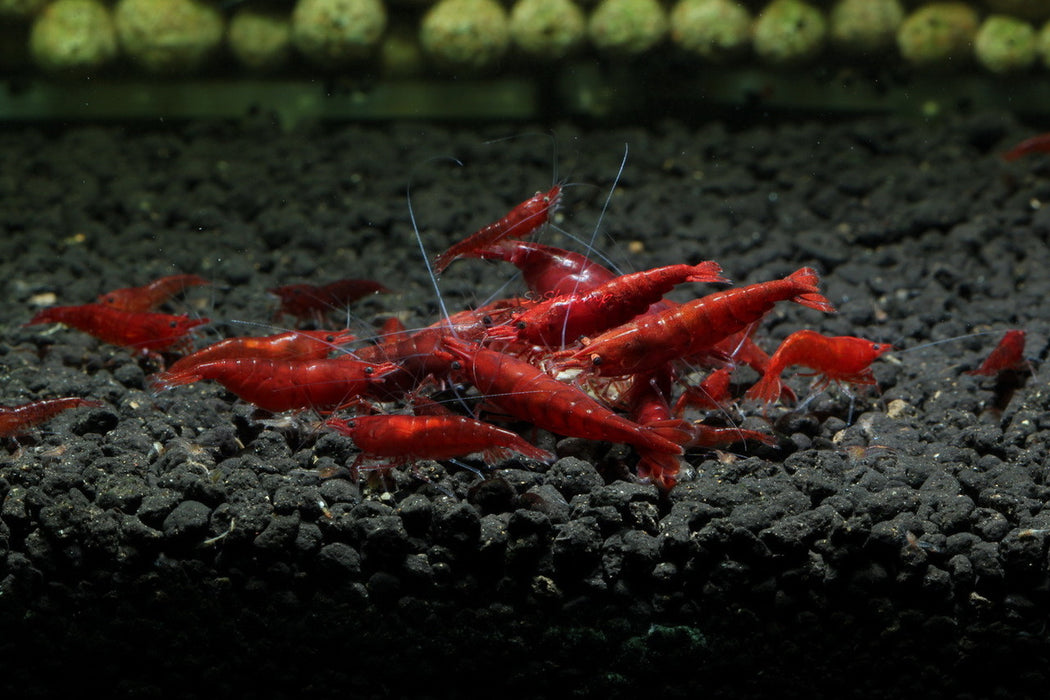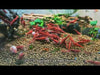 Painted Fire Red Shrimp, they come directly from red cherry created from select breeding. Lines are very bloody red, they might have some brown. Painted Fire Red shrimp can have a clear to bluish hue in their flesh with a solid red shell color.