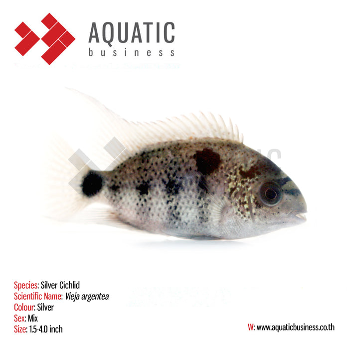 The Silver Cichlid (Vieja argentea) is found in the rivers and drainage systems of western Mexico. Their native river habitat is comprised mostly of rocky areas and submerged wood / tree stumps with most of the submerged vegetation growing near the river banks. As is common with many of the central American Cichlid species, the Silver Cichlid is quite aggressive and territorial.