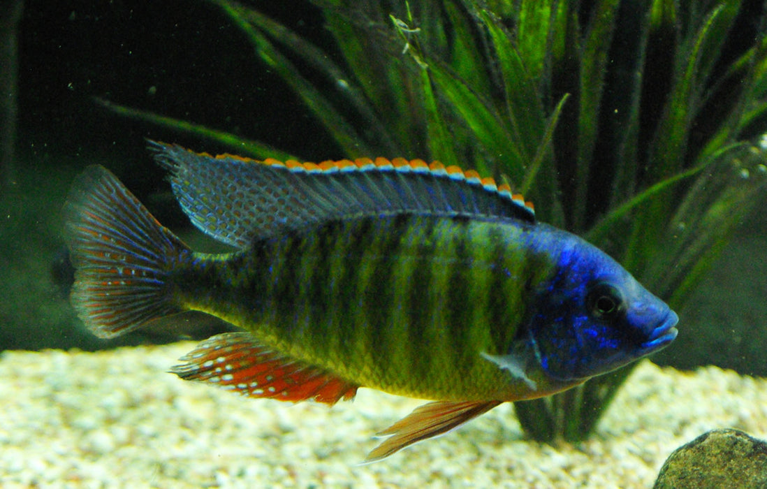 The Tangerine Tiger Cichlid is large Haplochromis species that is sexually dimorphic. Males grow much larger and have bronze colored bodies covered in numerous thick black bands. Their heads are a rich blue coloration. Females, by contrast, are silver or pale grey in hue with some black banding and stay relatively small.