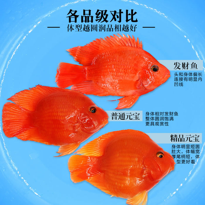 The Yuan Bao Red Blood Parrots have a rounded shape body compared to the traditional Blood Parrot. They have a wider and larger sized bodies, with bright red colors. Their backs and hips are longer than their tails.